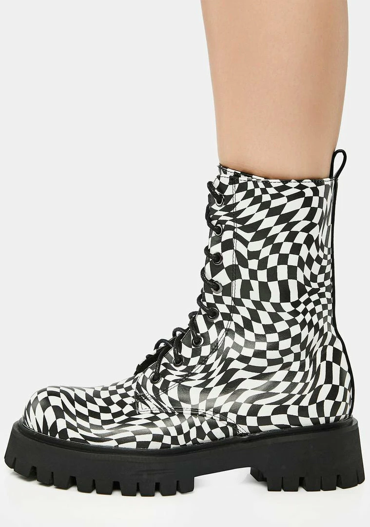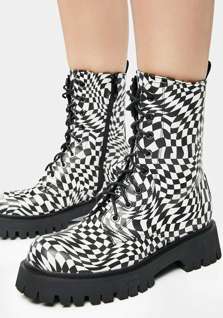 cuz you’ve got psychedelic vision! These combat boots have a vegan leather construction with a warped checkered print all over, adjustable laces, and side zip closures.