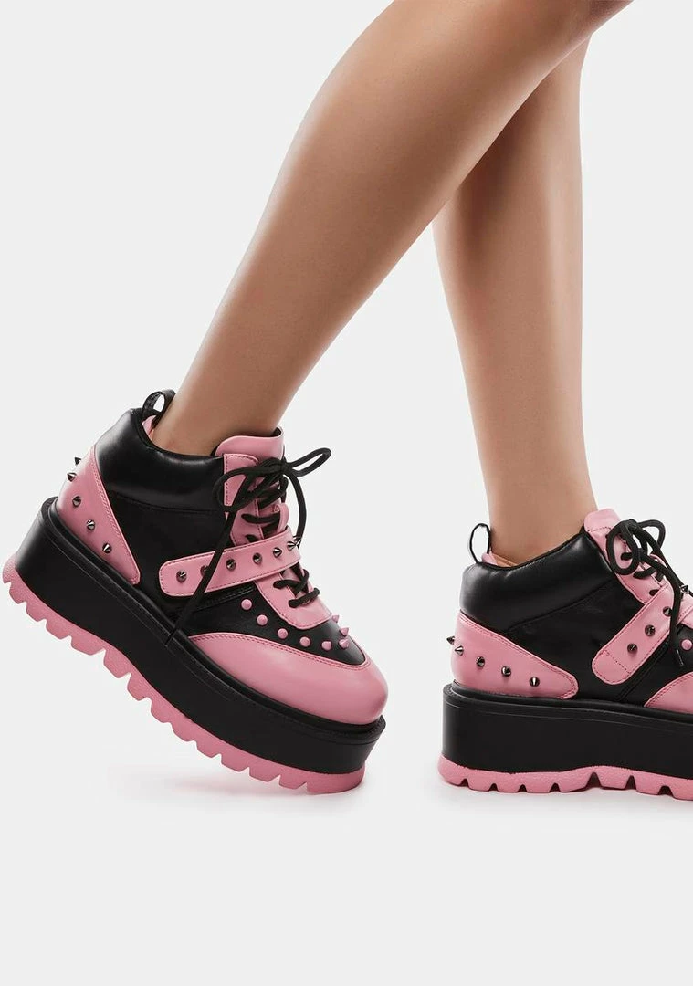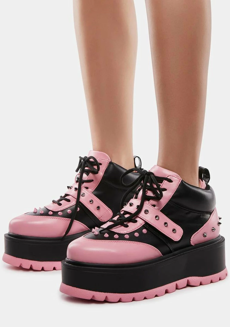 this is what kawaii heaven is made of. These sneakers come in a vegan leather construction, with a chunky platform sole, stud details, contrasting details, and lace up closures.