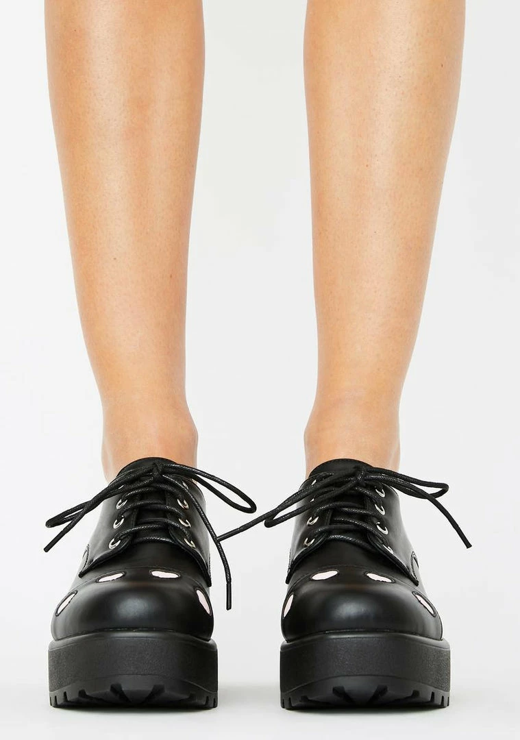 gotcha lookin’ sweet N’ sassy! You’re a diva doll in these chunky platform oxfords that have a vegan leather construction, pink heart motifs N’ adjustable lace-up closures.