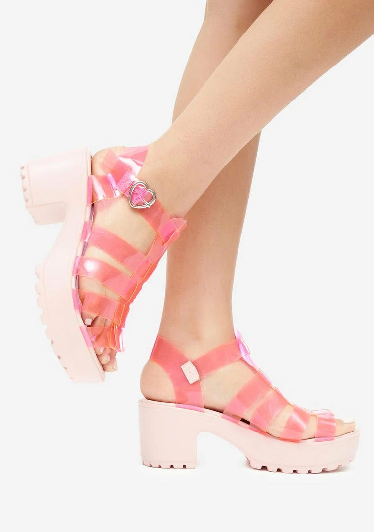 cuz youâre as cute as can be! These strappy jelly sandals have chunky block heels and adjustable heart-shaped buckle strap closures.