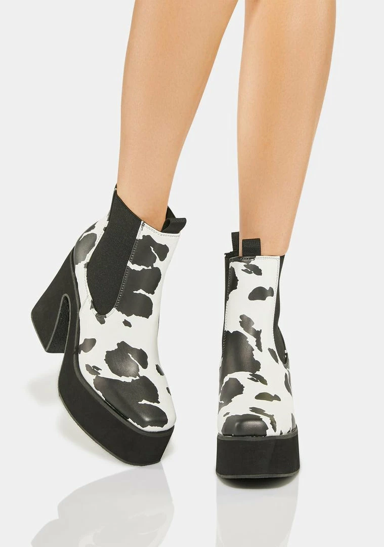 they don’t know how you do it. These vegan leather ankle boots come with pull tabs on the front and back for slipping on, elastic panels on the sides, a cow print all over, and a chunky heeled platform.