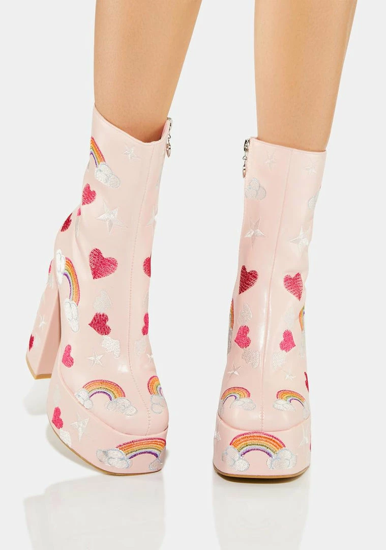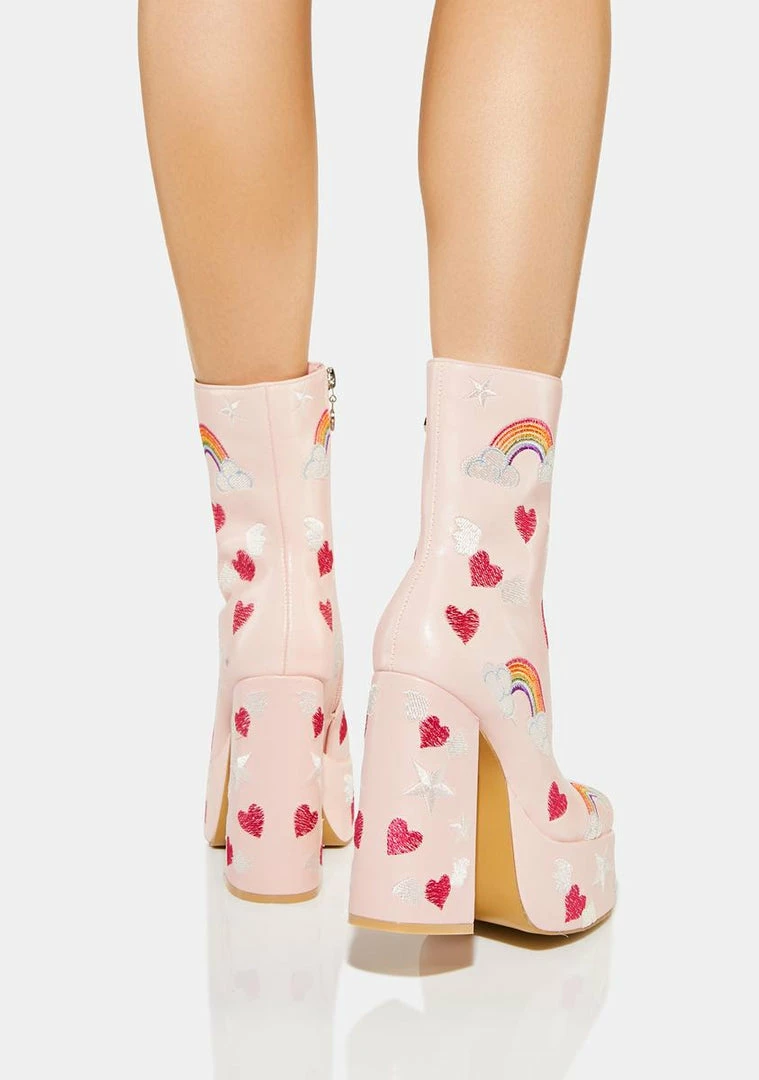 will have you stuck in a daydream! These vegan leather platform boots have chunky block heels, side zip closures with heart charms, and embroidered graphics all over with hearts, rainbows, and stars.