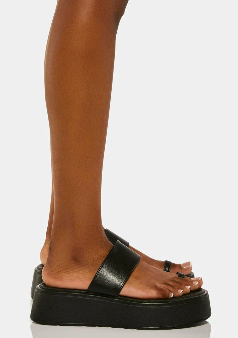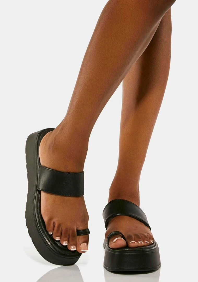 come in a vegan leather construction, with a platform sole, a toe strap, and a foot strap.