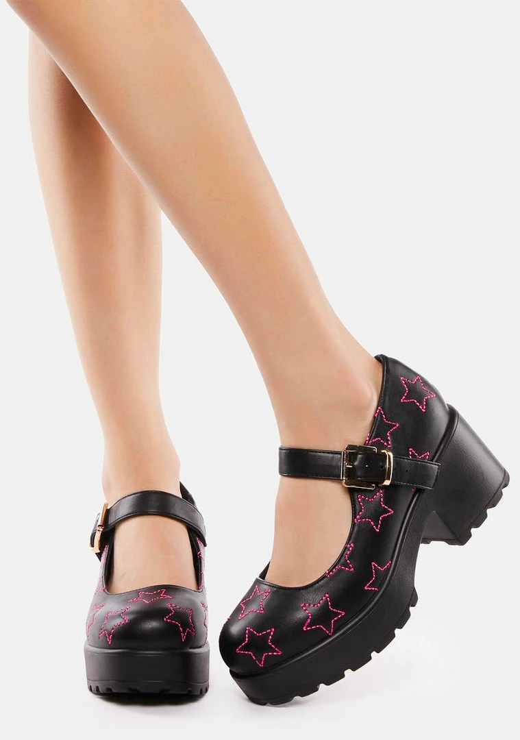 cuz it’s a princess’s little secret! These platform mary janes have a vegan leather construction, pink rhinestone star details all over, chunky block heels, and adjustable buckle strap closures.