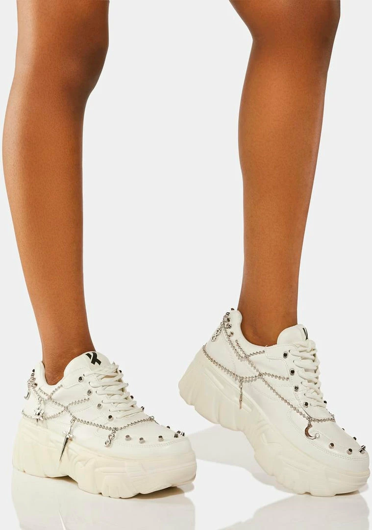 have a platform bubble sole, a vegan leather upper with a low ankle rise, metallic studs on the eyestay, heel and toe, and draped chain details with mystical charms.