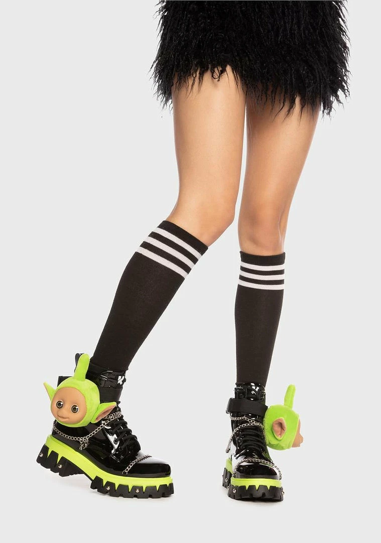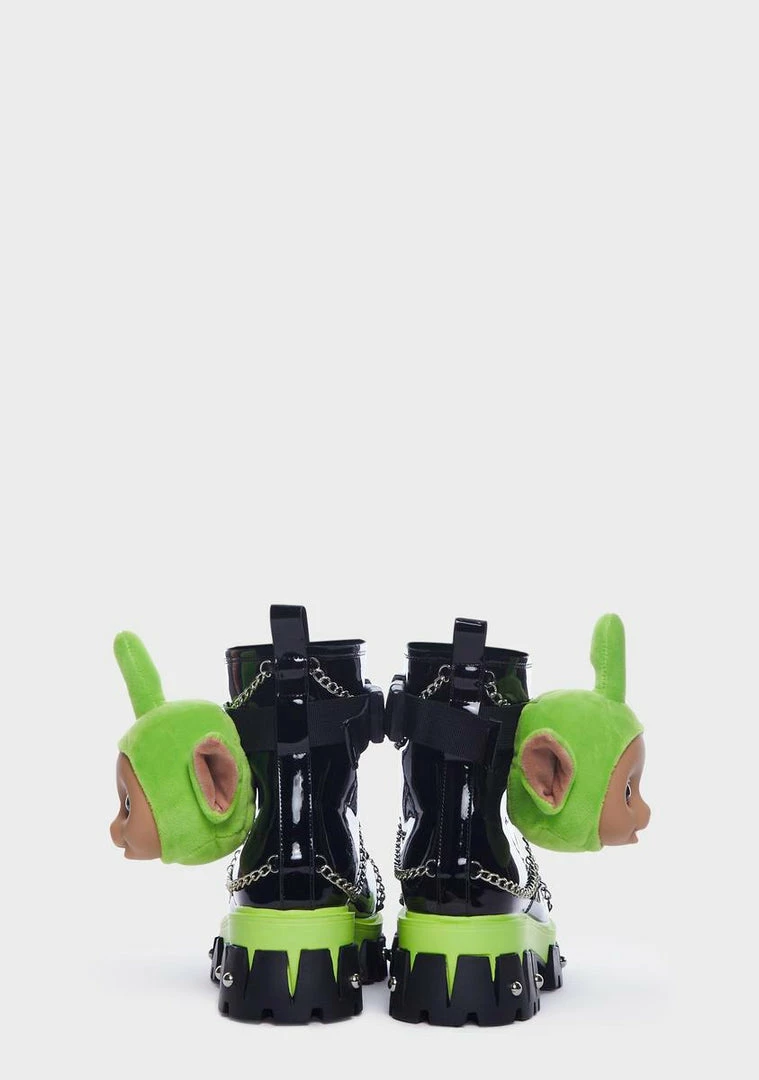 cuz it’s time to play! These platform boots have a patent vinyl vegan leather construction, treaded soles, metal chain detailing, Dipsy’s Head on the side with an adjustable buckle closure, pull tabs, and front lace up closures.